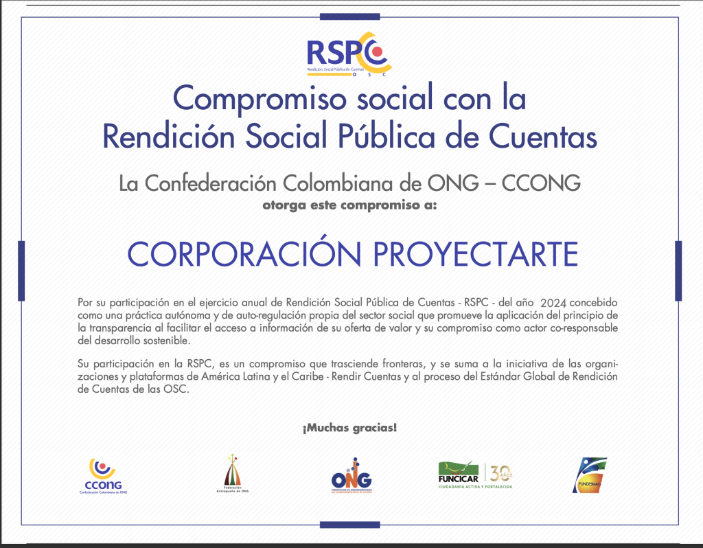 Accede a la información y documentación oficial de Proyectarte como Entidad Sin Ánimo de Lucro (ESAL). Aquí podrás encontrar los documentos relevantes que respaldan nuestra misión, visión y las actividades que realizamos para generar un impacto positivo en la comunidad.